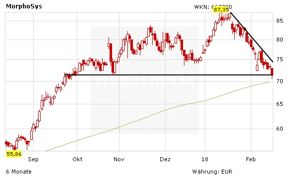 Noch im Januar sah es bei der Aktie von Morphosys danach aus, als könnte sie den Ausbruch nach oben schaffen. Doch im Zuge der Korrektur an den Märkten, dem Handeln von einigen Shortsellern und negativen Analystenkommentaren hat der Wert wieder den Rückzug angetreten. Zunächst haben die Analysten der britischen Großbank HSBC für einen Dämpfer gesorgt. Sie halten die Begeisterung der Anleger über den Wirkstoffkandidaten MOR208 für übertrieben. Demzufolge haben sie die Einstufung für die Aktie von „Halten“ auf „Reduce“ zurückgenommen, das Kursziel allerdings von 59 auf 64 Euro erhöht. „Der Aktienkurs unterstellt, dass MOR208 zugelassen wird und Morphosys die Vermarktung in Europa und den USA ohne ein Partnerunternehmen übernimmt", schrieb die Expertin Julie Mead. Zwar seien die frühen Daten bislang ermutigend, doch der Weg bis zur Vermarktung sei noch weit, unterstrich Mead.