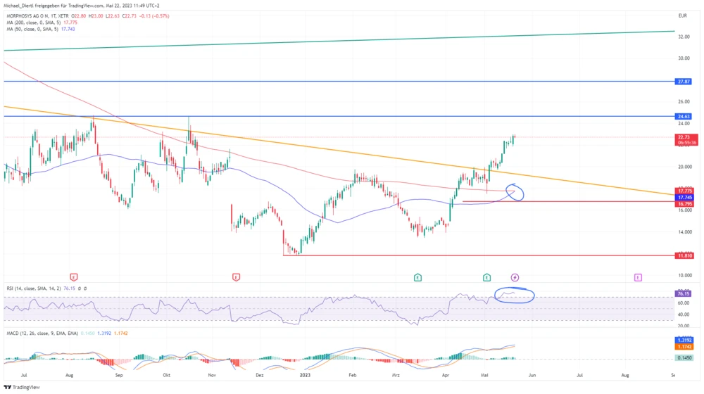 Die nächsten Ziele sind das Oktober-Hoch 2022 bei 24,63 Euro und das April-Hoch 2022 bei 27,87 Euro. Schafft die Morphosys-Aktie es sogar, diese beiden Hürden zu überwinden, rückt die psychologisch wichtige 30-Euro-Marke in den Fokus.