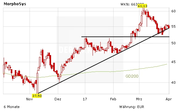 Die Aktie von Morphosys ist nach der Aufholjagd infolge einiger starker News zuletzt in eine Konsolidierungsphase übergegangen. Dabei hat der Wert die wichtige Unterstützung im Bereich von 52 Euro erfolgreich verteidigen können. Bei Morphosys stehen im laufenden Jahr noch einige wichtige Ergebnisse und Neuigkeiten an. Zudem stehen die Chancen gut, dass Ende dieses Jahres die erste Zulassung erfolgen könnte. Anleger, die etwas Geduld mitbringen, greifen auf dem aktuellen Niveau zu.