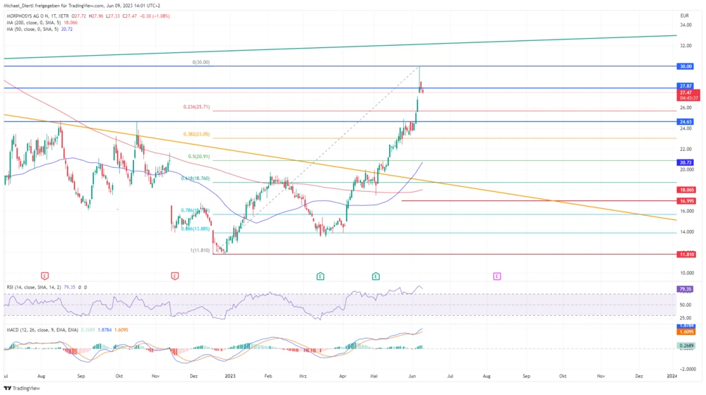 Nach dem Ausbruch über die Abwärtstrendlinie (orange Linie im Chart) kannte Morphosys kein Halten mehr. Zwar konsolidierte sie kurz im Bereich des Oktober-Hoch 2022 bei 24,63 Euro. Doch nachdem sie diesen Widerstand überwunden hatte, sprang sie innerhalb von drei Handelstagen auf das prognostizierte Ziel von 30 Euro.