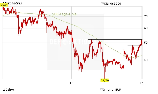 Dies könnte auch dem Aktienkurs weiteren Auftrieb verleihen. Die nächste wichtige charttechnische Hürde wartet bei 52 Euro. Gelingt der Sprung darüber, wäre dies ein weiteres Kaufsignal. Das Jahr 2017 wird ohnehin ein spannendes Jahr bei Morphosys. Im zweiten Halbjahr könnte mit Guselkumab die erste Zulassung in der Unternehmensgeschichte gelinge.