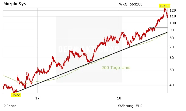 Der höhere Verlust basiert auf den gestiegenen Forschungsausgaben, insbesondere für den Antikörper MOR208. Anleger nutzen trotzdem den Quartalsbericht zum Anlass, Gewinne vom Tisch zu nehmen. Denn im Vorfeld hat die Morphosys-Aktie eine beeindruckende Rallye auf das Börsenparkett gelegt und ist auf ein neues 18-Jahres-Hoch geklettert.