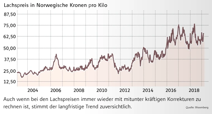 Der Grund hierfür ist ein Analystenkommentar aus dem Hause DNB. Deren Analysten rechnen mit einer deutlich geringeren Lachsnachfrage als der Großteil der anderen Experten. Hingegen erwartet die DNB ein stärkeres Angebotswachstum. Ihrer Ansicht nach dürften die Lachspreise 2019 bis 2021 durchschnittlich in einer Range von 55 bis 57 Norwegischen Kronen bewegen – also deutlich unter dem aktuellen Niveau (siehe Chart).