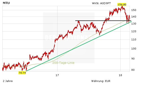 Den Börsianern reichen die guten Nachrichten nicht. Die MTU-Aktie verliert am Mittwoch zweitweise mehr als drei Prozent an Wert und gehört damit zu den schwächsten Werten im MDAX. Seit dem Allzeithoch bei 156,80 Euro Anfang Januar summieren sich die Verluste nun auf gut zwölf Prozent. Die aktuellen Probleme sollten das Geschäft von MTU indes nur vorübergehend belasten, so dass die Aktie ihren Aufwärtstrend bald wieder fortsetzen könnte. DER AKTIONÄR bleibt bei seinem Kursziel von 170 Euro. Ein nachhaltiger Rutsch unter 130 Euro wäre technisch betrachtet hingegen ein kurzfristiges Verkaufssignal.
