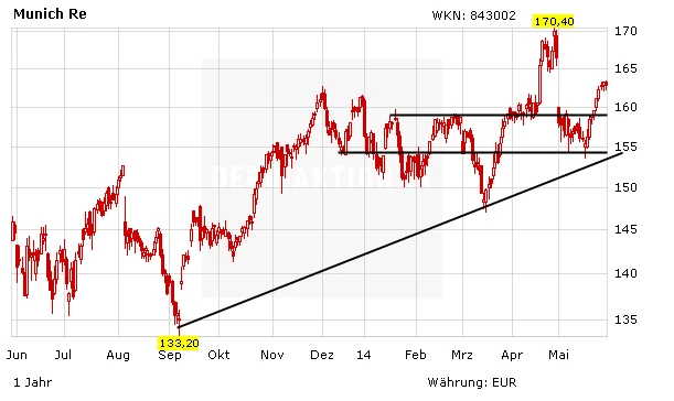Analyst William Howlett vom Analysehaus S&P Capital IQ hat das Kursziel des Versicherungskonzerns von 165 auf 170 Euro angehoben, aber die Einstufung auf "Hold“ belassen. Er habe seine Schätzungen für das Ergebnis je Aktie 2014 und 2015 angehoben, da er inzwischen von einer geringeren Schaden-Kosten-Quote des weltgrößten Rückversicherers ausgehe, so der Experte in seiner jüngsten Studie. Große, katastrophenbedingte Schäden seien im abgelaufenen Quartal ausgeblieben. Zudem habe der Versicherer in seinem Marktausblick herausgestellt, dass das Prämienwachstum hinter seinem Primärgeschäft zurückbleiben dürfte.