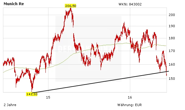 Die Aktie der Munich Re hat sich vom Fels in der Brandung zum Sorgenkind entwickelt. Am Montag rutscht der Titel unter die Unterstützung im Bereich 154 Euro und fällt auf den tiefsten Stand seit Herbst 2014.