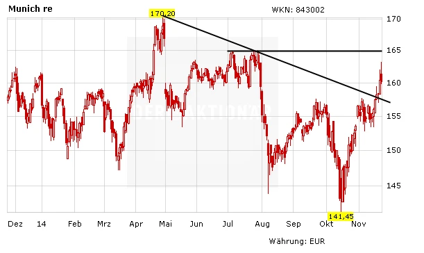 DER AKTIONÄR ist optimistisch für die Aktie. Angesichts lächerlich niedriger Sparzinsen und mickriger Renditen bei vermeintlichen sicheren Staatsanleihen werden immer mehr Anleger an der Börse anlegen. Dann sind Aktien mit einer hohen Dividendenrendite – die Munich Re kommt auf 4,7 Prozent – erste Wahl. DER AKTIONÄR sieht das Kursziel für den Wert bei 190 Euro. Der Stopp sollte bei 135 Euro gesetzt werden.
