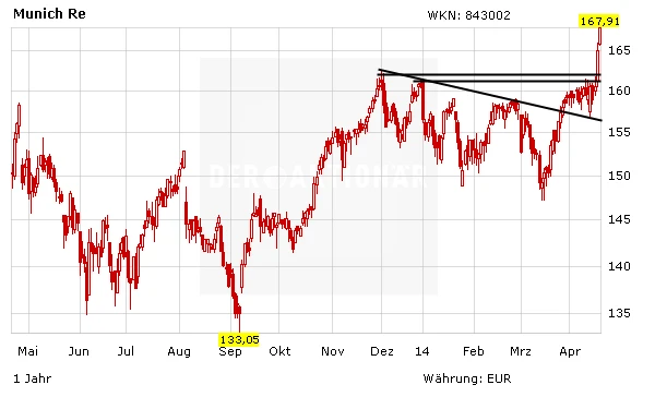 Der Aktie der Munich Re ist am Gründonnerstag der Ausbruch über wichtige Widerstände geglückt. Auch im heutigen Handel kann das Papier des weltgrößten Rückversicherers wieder deutlich zulegen. Besonders attraktiv macht einen Einsteig zudem die bald anstehende Zahlung der üppigen Dividende.