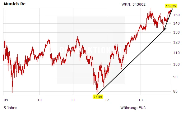 Am Mittag klettert die Munich-Re-Aktie um 0,7 Prozent auf 159,05 Euro und damit auf den höchsten Stand seit September 2002. Die nächsten charttechnischen Hürden warten nun im Bereich 170 bis 175 Euro. Sollten auch diese Marken überwunden werden, würde die 200-Euro-Marke in den Fokus rücken. Das würde ein Potenzial von 26 Prozent bedeuten – auf Sicht von zwölf Monaten eine realistische Marke.