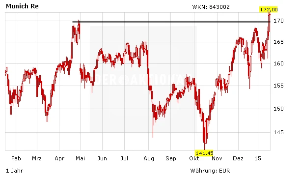 Im Dezember war der Anlauf noch gescheitert. Nun hat die Aktie der Munich Re das Hoch vom Mai genommen. Mit 172,00 Euro kletterte der Titel gleichzeitig auf den höchsten Stand seit zwölf Jahren. Charttechnisch könnte es kaum besser aussehen für den Rückversicherer.