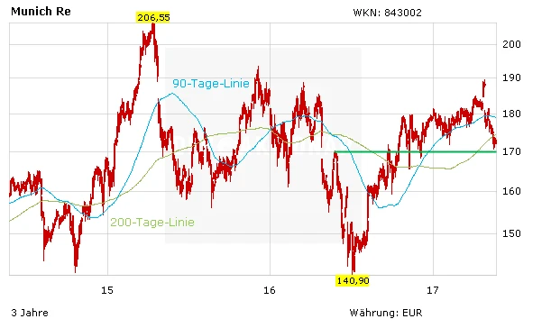 Fundamental ist die Aktie der Munich Re mit einem Kurs-Buchwert-Verhältnis von 0,8 günstig bewertet. Das KGV liegt bei 12, während es für die Gesamtbranche 10 beträgt. Im kommenden Jahr erwarten Analysten jedoch ein KGV von nur noch 11 für die Munich Re. Mit einer Dividendenrendite von fünf Prozent hebt sich die Aktie klar von der Konkurrenz ab, die im Mittel nur auf 4,4 Prozent kommt. DER AKTIONÄR sieht trotz der jüngsten Schwächephase noch reichlich Kurspotenzial bei dem Wertpapier. Das Ziel beträgt 220,00 Euro, wobei Anleger einen Stopp bei 160,00 Euro setzen sollten.
