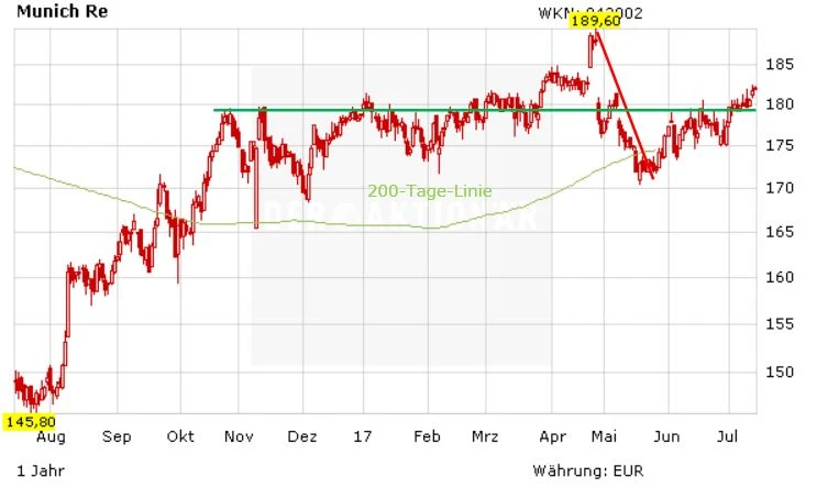 Bereits Ende Mai hat der Kurs der Munich Re den kurzfristigen Abwärtstrend bei 172,70 Euro nach oben verlassen. Dann fehlten allerdings die Impulse. In den letzten Tagen profitierte die Aktie jedoch vom positiven Gesamtmarkt und begann das Gap zwischen 181,20 und 187,10 Euro zu schließen. Gelingt es über die Marke von 187,10 Euro zu steigen und die Kurslücke komplett nach oben zuzumachen, wäre das aus charttechnischer Sicht ein positives Signal. Der nächste Widerstand läge dann um 194,06 Euro. Eine Unterstützung befindet sich bei 179,50 Euro.