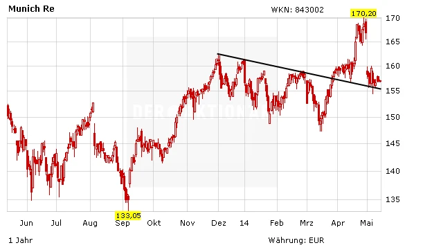 Denn die Munich Re will zwischen dem 1. Mai 2014 und der nächsten Hauptversammlung am 23. April 2015 bis zu 13 Millionen eigene Aktien im Volumen von maximal einer Milliarde Euro zurückkaufen. Der Erwerb dürfte wohl in mehreren Tranchen erfolgen. Im Rahmen der ersten Tranche sollen vom 14. Mai an bis zum 8. August rund 250 Millionen Euro für den Kauf eigener Anteile investiert werden. Der Rückkauf könnte auch über den Einsatz von Derivaten erfolgen.