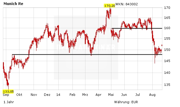 Trotz eines Gewinnsprungs hat Munich Re bei den Quartalszahlen die Erwartungen der Analysten zuletzt verfehlt. Die Erholung beginnt nun jedoch. Langfristig bleibt der Titel weiterhin ein klarer Kauf. Das starke Management, die sehr gute Marktstellung und die hohe Dividendenrendite überzeugen. Mit einem KGV von 9 ist der DAX-Titel zudem weiterhin günstig bewertet. Der Stoppkurs bei 135 Euro schützt vor größeren Verlusten.