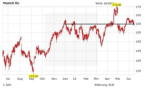 Munich Re hat sich vom Dividendenabschlag Anfang Mai noch nicht erholt. Aktuell notiert der DAX-Wert im Bereich der wichtigen horizontalen Unterstützung bei 160 Euro. Für die Experten von Bernstein Research ist die Aktie damit leicht überbewertet.