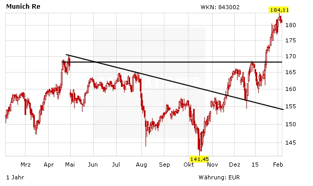 Denn die Anteilseigner des DAX-Konzerns können sich für 2014 über eine Ausschüttung von 7,75 Euro pro Aktie freuen. Im vergangenen Jahr erhielten sie noch 7,25 Euro, erwartet wurde am Markt lediglich eine Erhöhung um 0,25 Euro. Da die Munich Re seit 1969 nicht mehr die Dividende gesenkt hat, dürfen sich die Aktionäre also wohl auch in den kommenden Jahren auf eine satte Dividende von mindestens 7,75 Euro freuen, was aktuell einer Rendite von stattlichen 4,3 Prozent entspricht.
