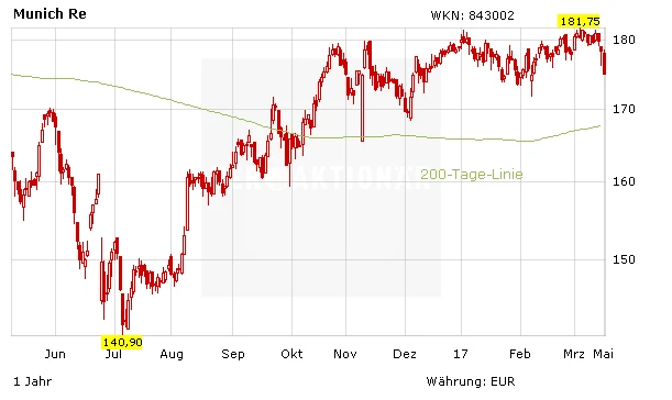 Fundamental ist die Aktie mit einem KGV von 12 günstig bewertet. Attraktiv ist zudem das Kurs-Buchwert-Verhältnis von 0,9. Aktionäre von Munich Re werden mit einer hohen Ausschüttung belohnt: Die Dividendenrendite beträgt aktuell 4,8 Prozent. DER AKTIONÄR rät zum Einstieg mit einem Kursziel von 220 Euro. Ein Stopp sollte bei 160 Euro gesetzt werden.