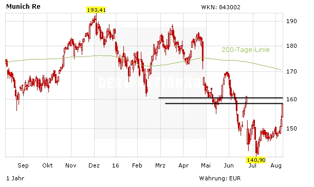 Die Munich Re hat beim Quartalsergebnis noch die Kurve gekriegt. Zwar dürften Niedrigzinsen und der Umbau der Ergo den Konzern noch länger begleiten. Grundsätzlich ist der Titel aber mit einem KGV von aktuell 10 und einer Dividendenrendite von 5,2 Prozent auch im Branchenvergleich günstig bewertet. Charttechnisch hat sich die Situation verbessert. Mit den Zahlen im Rücken steht die Aktie kurz davor, den Widerstand bei 158/160 Euro zu knacken. Trader können eine Position aufbauen, langfristig orientierte Anleger warten aber noch ab, bis sich die Lage bei Ergo gebessert hat.