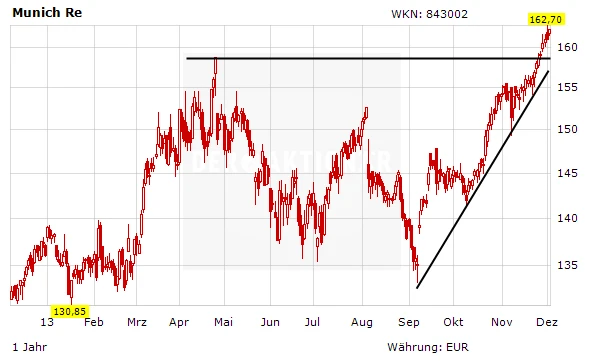 Die Munich-Re-Aktie hat vor Kurzem den Widerstand bei 158,65 Euro hinter sich gelassen und damit ein neues 11-Jahres-Hoch erklommen. Gleichzeitig generierte der Titel damit ein glasklares Kaufsignal.