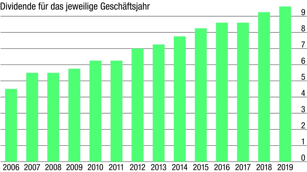 2018 schüttete das Unternehmen eine Dividende von 9,25 Euro aus. Für das laufende Jahr gehen die Schätzungen von einer Dividende in Höhe von 9,60 Euro aus. Das entspricht einer Dividendenrendite von 3,5 Prozent.