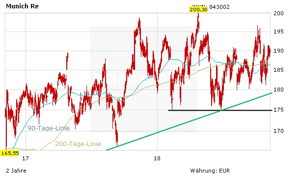 Die Aktie der Münchener Rück legt heute im frühen Handel weiter zu. Auch charttechnisch sieht der konservative Wert gut aus. Die 90-Tage-Linie hat bei 186,50 Euro die 200er von unten nach oben geschnitten, was häufig für weiter anziehende Kurse spricht. DER AKTIONÄR rät weiterhin zum Kauf der Aktie und sieht ein Kursziel von 225 Euro. Ein Stopp kann bei 175 Euro gesetzt werden.