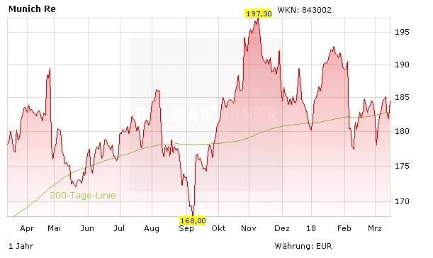 Die Papiere des Rückversicherers zeigten sich deutlich volatil in den letzten Wochen und Monaten. Nicht zuletzt die Serie schwerer Wirbelstürme in den USA und der Karibik im letzten Jahr ließen die Kurse deutlich unter Druck geraten. Dennoch zeigt sich der 138 Jahre alte Konzern als Kerngesund und punktet mit seiner hohen Dividendenrendite von 4,65 Prozent. Investierte Anleger bleiben an Bord, beachten aber vorsichtshalber einen Stopp-Kurs von 175 Euro.