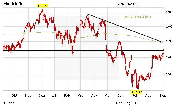 In einem schwierigen Marktumfeld steht die MunichRe mit einer soliden Kapitalausstattung wie der Fels in der Brandung. Der Umbau der Tochter ERGO ist auch in vollem Gange. Fundamental ist die Aktie mit einem Kurs-Buchwert-Verhältnis von nur 0,8 und einem aktuellen KGV von 10 klar unterbewertet. Eine Dividendenrendite von satten fünf Prozent hält Anleger bei Laune. Charttechnisch wurde zuletzt der Widerstand bei 165,00 Euro geknackt. Fällt auch der übergeordnete Abwärtstrend bei 167,00 Euro, würde die Aktie ein neues Kaufsignal generieren. Wer noch nicht dabei ist, steigt jetzt ein mit Stopp bei 140,00 Euro.