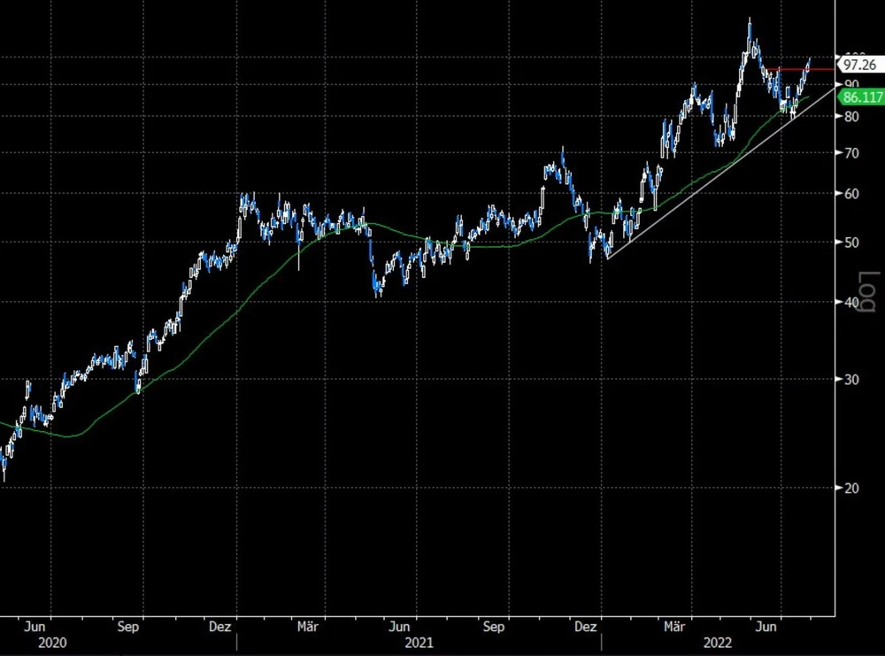 Nach dem Ausbruch aus dem kurzfristigen Abwärtstrend, dem Überspringen der 90,00-Dollar-Marke wurde auch der Widerstandsbereich um die Zwischenhochs aus dem Juni relativ problemlos aus dem Weg geräumt. Rein charttechnisch betrachtet gibt es auf dem Weg zum Allzeithoch bei 115,76 Dollar nun kaum noch wirklich ernstzunehmende Widerstände.