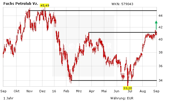 Langfristig befinden sich die Vorzugsaktien von Fuchs Petrolub in einem intakten Aufwärtstrend. Kurzfrisitg ergibt sich ein interessantes Chartbild. Die Aktie fiel Anfang Februar auf ein Tief bei 33,61 Euro zurück. Eine dynamische Erholung führte die Aktie des Mannheimer Schmierstoffspezialisten dann aber innerhalb weniger Wochen zurück bis an die 41-Euro-Marke. Im Anschluss wiederholte sich das Bild: Der Kurs rutschte bis Ende Juni erneut bis in den Bereich um 33 Euro ab, ehe es von diesem Niveau aus umgehend wieder hoch ging. In den vergangenen Tagen konsolidierte die Aktie knapp unter der Marke von 41 Euro. Heute deutet sich eine Fortsetzung der Aufwärtsbewegung an. Erweist sich der Ausbruch über den Widerstand bei 41 Euro als nachhaltig, würden die nächsten Ziele aus technischer Sicht bei 45 bzw. 51 Euro liegen.