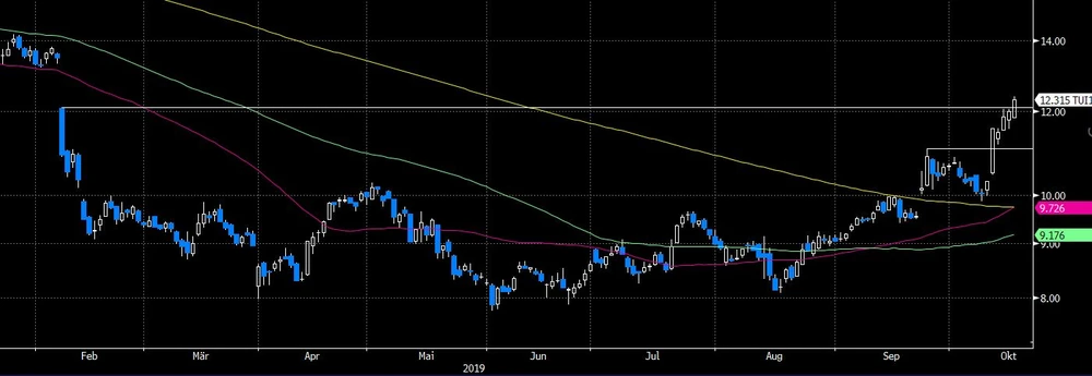 Auch beim TUI-Chart wäre nun nach dem kräftigen Kursanstieg der vergangenen Wochen – knapp 50 Prozent seit Mitte August – eigentlich Durchschnaufen angesagt. Doch da die Aktie nun über die Marke von 12,09 Euro geklettert ist, könnte der Kurs nun weiter Fahrt aufnehmen. Denn nun stehen die Chancen gut, dass der Kurs das im Zuge der überraschenden Gewinnwarnung im Februar aufgerissene Gap bei 13,31 Euro schließen wird.