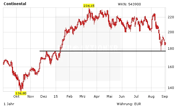 Den Sorgen um das Wachstum in China und der DAX-Schwäche der vergangenen Wochen konnte sich auch die Conti-Aktie nicht entziehen: Notierte der Titel Anfang August noch knapp unterhalb des Allzeithochs, hat er seitdem knapp 20 Prozent nachgegeben.