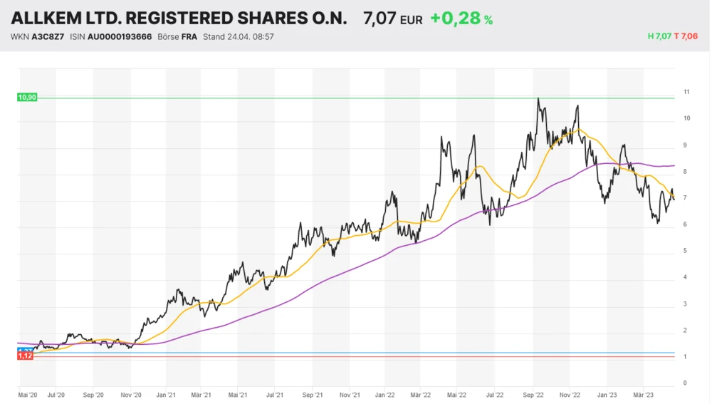 Dazu gehört der australische Lithium-Player Allkem. Die Aktie ist Mitglied des neun Werte umfassenden DER AKTIONÄR Best of Lithium Index und nimmt dort aktuell die höchste Indexgewichtung ein. Von den Aussagen des chilenischen Präsidenten zeigte sich der Kurs unbeeindruckt, die Aktie schloss am Freitag nahezu unverändert.