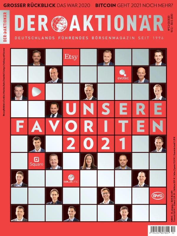 Die Redakteure des AKTIONÄR verraten den Lesern in der aktuellen Ausgabe ihre jeweiligen Favoriten, die 2021 für satte Renditen sorgen sollen. Die Auswahl ist extrem vielfältig, jeder Anlegertyp kommt auf seine Kosten. Selbstverständlich spielen Zukunftstrends eine große Rolle, die Tipps kommen aus Europa, den USA oder China, von hochkapitalisierten Big Playern bis hin aufregenden Small Caps und Hidden Champions ist alles dabei. Sie wollen die Favoriten 2021 kennenlernen? Dann lesen Sie jetzt DER AKTIONÄR.