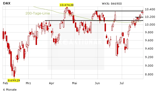 Der DAX hat am Donnerstag zunächst die am Vortag aufgerissene Kurslücke (10.275) geschlossen und im Anschluss das Hoch vom 31. Mai bei 10.365 Punkten getestet. In der Spitze stieg der deutsche Leitindex sogar auf 10.381,90 Punkte und damit den höchsten Stand seit Ende April.