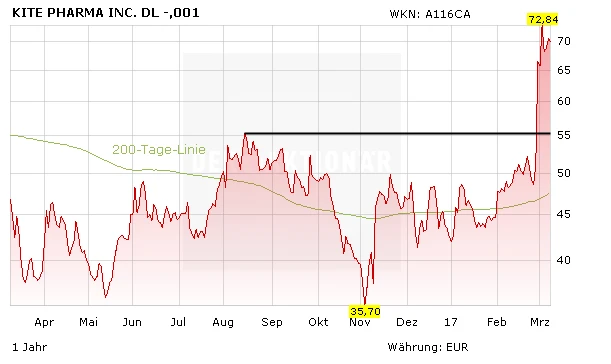 Knapp 50 Prozent binnen weniger Tage. Kite Pharma überraschte mit bahnbrechenden Studiendaten im Rahmen einer Krebsimmuntherapie. Doch die Biotech-Firma ist nicht die Einzige, die an der sogenannten CAR-T-Zell-Therapie forscht. Gut möglich, dass eine weitere Firma vor dem Durchbruch steht und schon bald die alten Höchststände attackiert.