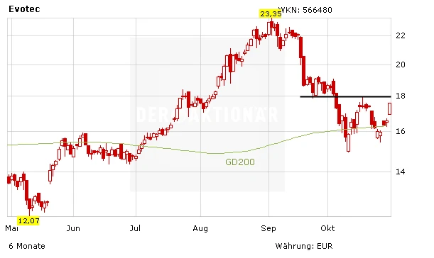 Mit Evotec ist ein weiterer deutscher Biotechwert aus dem TecDAX heute zur großen Aufholjagd gestartet. Das Papier gewinnt am Nachmittag mehr als fünf Prozent auf 17,59 Euro. Damit befindet sich der Wert unter den zehn besten Titeln des Tages im TecDAX wieder. Zuvor hat die Aktie erfolgreich die 200-Tage-Linie verteidigen können. Aus charttechnischer Sicht wäre nun wichtig, dass im Zuge der Erholungsbewegung die Marke von 18 Euro überwunden werden kann. Die Aktie bleibt ganz klar weiter einer der großen Favoriten des AKTIONÄR aus dem europäischen Biotech-Sektor. Aus langfristiger Sicht sind die aktuellen Kurse klare Kaufchancen. Spannend wird es bei dem Wert Mitte November. Am 13. Veröffentlicht die Gesellschaft die 9-Monatszahlen. Zudem präsentiert Evotec in den kommenden Wochen auf einigen Investorenkonferenzen, was dem Wert weiteren Support verleihen könnte.