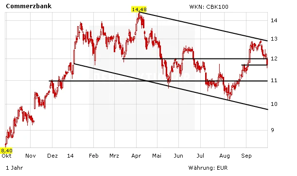 Aus technischer Sicht besteht die Gefahr, dass die Commerzbank in diesem Abwärtstrendkanal weiter nach unten läuft. Kurzfristige Unterstützung bietet zwar die Marke von 11,71 Euro, doch gibt es hier bis dato nur wenige Auflagepunkte und entsprechend ist die Relevanz nicht sehr hoch. Ein Einstieg drängt sich derzeit nicht auf.
