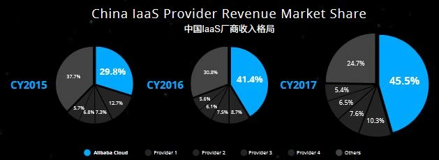 Alibabas Cloud-Sparte wird ebenfalls aufgerüstet und dürfte den Markt in der Volksrepublik dann noch stärker kontrollieren. 2017 kam das Geschäft mit der "Wolke" auf einen Marktanteil von 45 Prozent (2016: 41,4%). Der Anteil entsprach dem gemeinsamen Wert der nächsten 8 Konkurrenten. Im globalen Wettbewerb liegen lediglich Amazon (AWS) und Microsoft (Azure) vor den Chinesen.