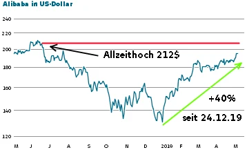 Die Alibaba-Aktie notiert seit dem Jahreswechsel starke 40 Prozent im Plus. Am Freitag kletterte das Papier des größten E-Commerce-Unternehmens in China auf 195 Dollar und damit auf den höchsten Stand seit Juli 2018!