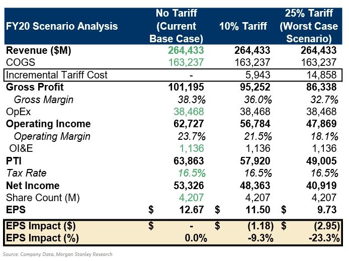 Morgan Stanley hat eine Rechnung für diesen Fall aufgestellt und dabei unterstellt, dass Apple die Mehrkosten nicht an die Kunden weitergibt, sondern selbst trägt.