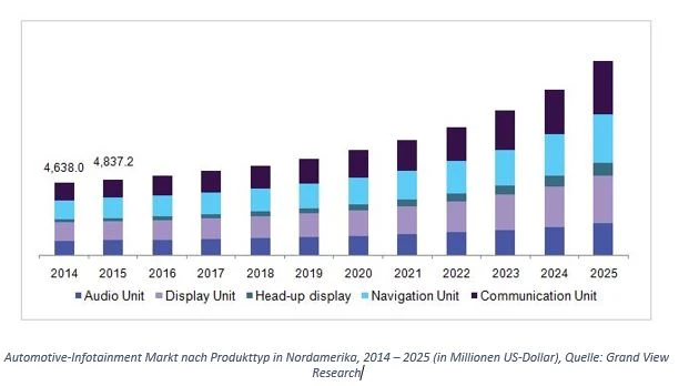 Grand View Research zufolge ist Infotainment ein zunehmend wichtiger Entscheidungsfaktor beim Autokauf. Laut der im Mai 2017 veröffentlichten Studie war der globale Marktanteil der automotiven Infotainment-Systeme im Jahr 2016 auf etwa 15 Milliarden Dollar geschätzt. Wie die untenstehende Grafik zeigt, wird allein in Nordamerika mit einem Anstieg des Infotainment-Marktes gerechnet.