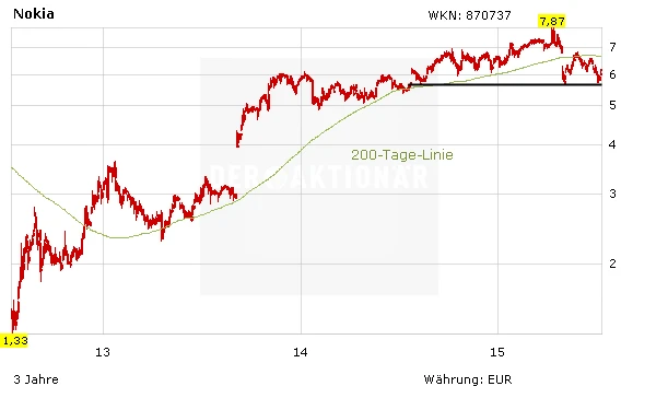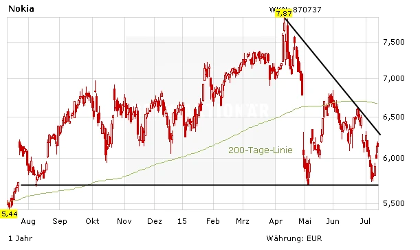 Es wird sicherlich spannend, welchen Partner Nokia für die Produktion des Smartphones gewinnen kann. Charttechnisch gesehen herrscht weniger Ausbruchsstimmung, sondern eher ein gemischstes Bild. Das Papier hat zwar mit dem Doppeltief bei 5,70 Euro eine Unterstützung ausgebildet, die auch unbedingt halten muss, damit der Titel nicht nach unten durchrutscht. Im Bereich von 3 bis 4 Euro ist noch eine Kurslücke offen, die im Extremfall angelaufen werden könnte. Zudem befindet sich die Nokia-Aktie weiterhin im Abwärtstrend.