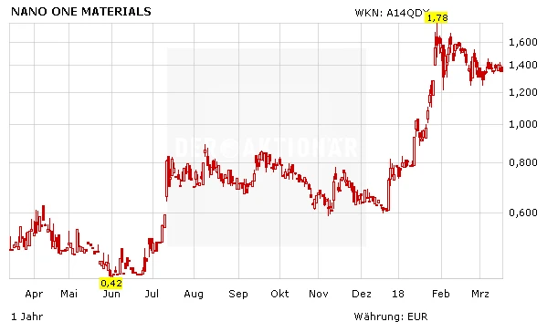 Nicht zu verachten außerdem: das starke Management-Team. CEO und Gründer Dan Blondal kann auf mehr als 25 Jahre Erfahrung im Hightech-Segment bei Kodak zurückblicken. Den eigentlichen Ritterschlag erhielt Nano One aber mit dem Einstieg des Chairman, Paul Matysek. Er ist der erfolgreichste Firmengründer Kanadas und hat bereits drei Firmen erfolgreich für insgesamt mehr als zwei Milliarden Dollar verkauft. Nano One ist derzeit mit 129 Millionen Dollar bewertet.
