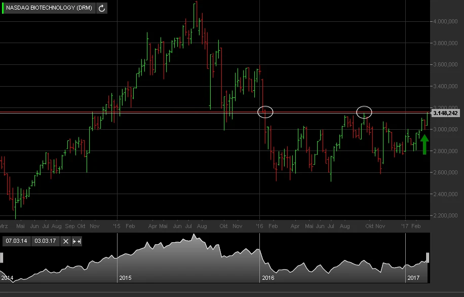 Mit einem nachhaltigen Sprung über den hartnäckigen Widerstand um 3.150 Punkte könnte dem NBI der Mega-Ausbruch gelingen. Gut möglich, dass in einem positiven Marktumfeld Anschlussgewinne bis zur nächsten großen Hürde im Bereich von 3.600 Punkten erfolgen. Jedoch können negative Aussagen beziehungsweise Gesetze von Donald Trump jederzeit für Verunsicherung in der Branche sorgen. Nach wie vor zählen Biotech-Aktien zu den schwankungsanfälligsten Titeln.