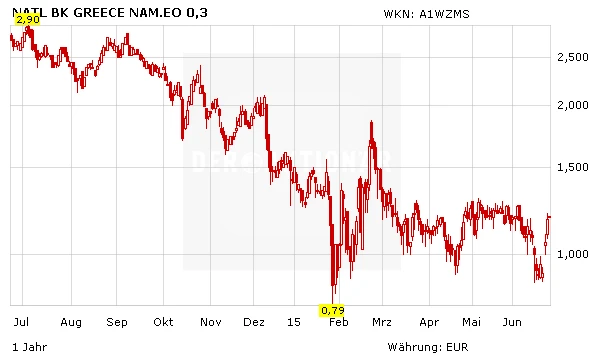 Ganz klar: Ein Kauf der Aktie der National Bank of Greece (NBG) ist eine klare Wette auf den Verbleib Griechenlands in der Eurozone. Schließlich drohen im Falle eines „Grexit“ erhebliche Verluste. Andererseits verfügen die Titel der Großbank nach der Talfahrt der vergangenen Monate auch über großes Nachholpotenzial. Im Vergleich zur Alpha Bank und der Piraeus Bank verfügt die NBG vor allem in der Türkei über ein starkes Standbein im Ausland. Fast die Hälfte der Einnahmen wird außerhalb des kriselnden griechischen Heimatmarktes erzielt. Des Weiteren sehen Analysten den fairen Wert der Aktie deutlich über dem aktuellen Kursniveau.