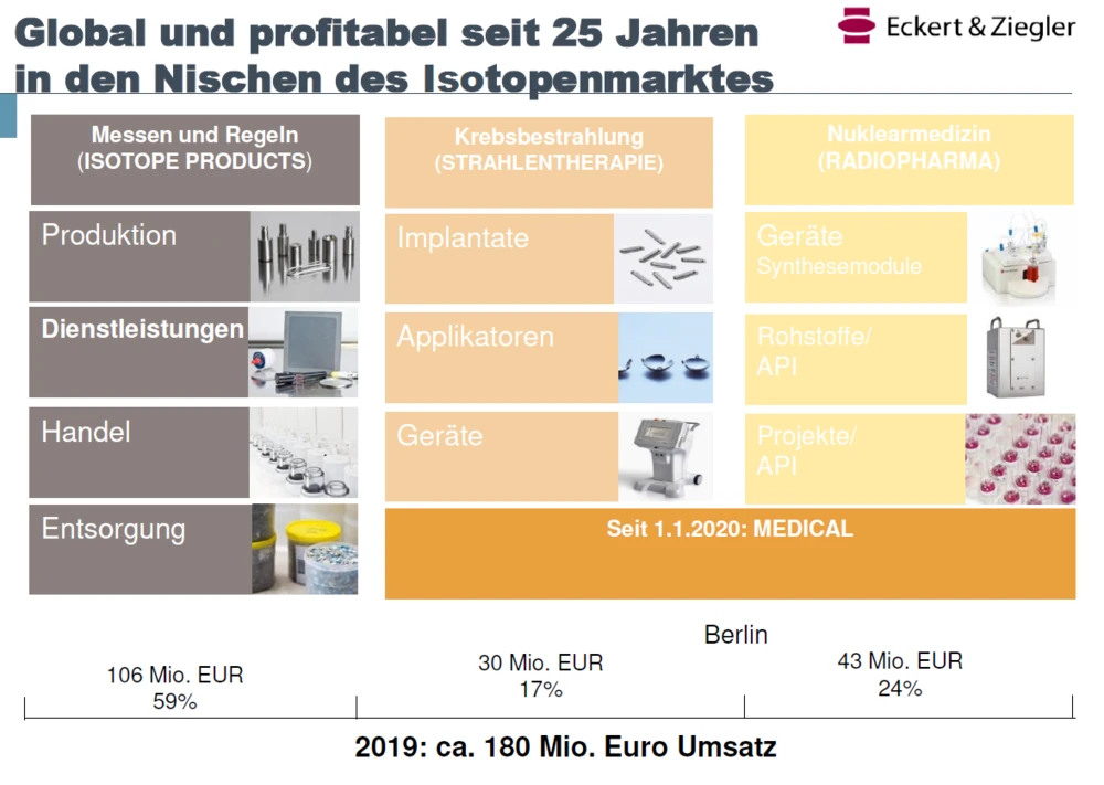 Das Medizin- und Strahlentechnik-Unternehmen zählt zu den größten Profiteuren der steigenden Nachfrage nach dem Radioisotop Gallium-68 zur Lokalisierung und Behandlung von Tumoren. Der Gallium-68-Generator der Berliner ist extrem kosteneffizient. Als Teil eines Duopols kann Eckert & Ziegler von Vorteilen bei der Preisbildung profitieren. Neben dem Gallium-68-Generator hat die Gesellschaft noch eine Reihe von anderen „heißen Eisen“ im Feuer.