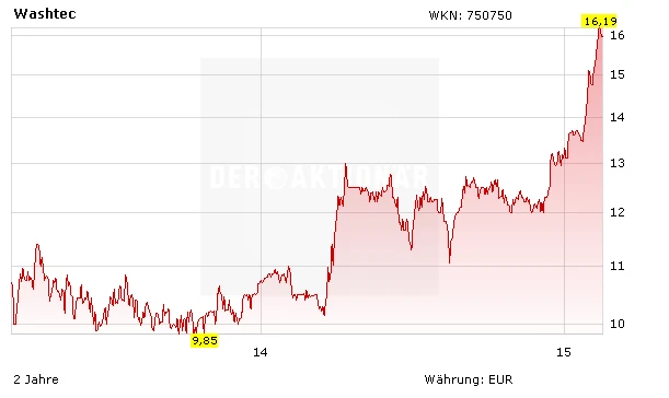 Das spielt der Washtec AG in die Karten. Die Augsburger sind mit rund 20.000 installierten Autowaschanlagen weltweit führend. Dabei bietet die Gesellschaft ein umfassendes Leistungsspektrum an, von der Finanzierung und Planung der Anlage bis zu deren Betrieb. Abgerundet wird das Paket mit einem entsprechenden Service- und Dienstleistungsprogramm. Das Gros der Umsätze wird dabei mit Neu- und Gebrauchtmaschinen erlöst.