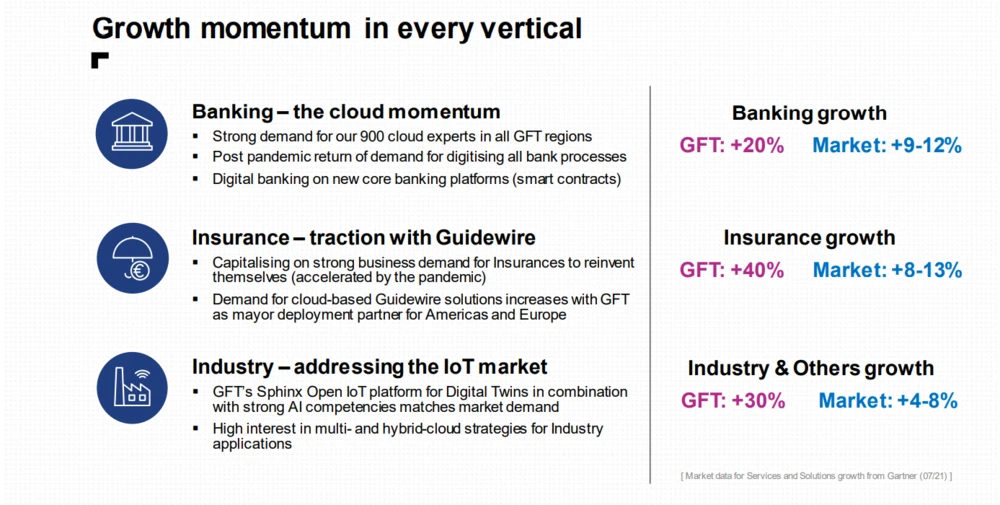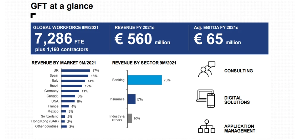 Doch damit nicht genug: Im kommenden Jahr dürfte GFT beim Umsatz erneut um mindestens 20 Prozent wachsen. Dabei wird eine bereinigte EBITDA-Marge von rund 11,5 Prozent erwartet. Am Ende könnten ein Umsatz von 672 Millionen Euro und ein bereinigtes EBITDA von über 77 Millionen Euro zu Buche stehen.