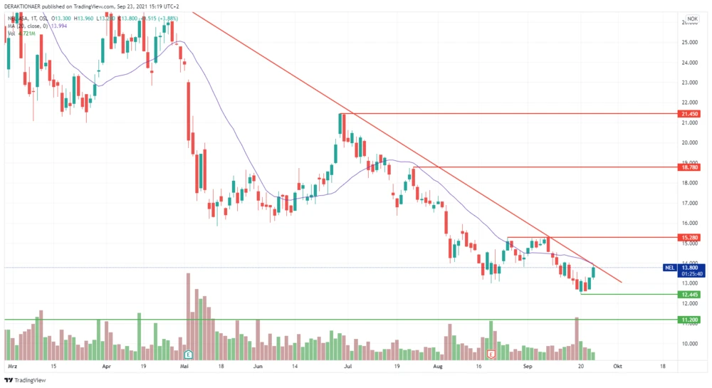 Dieser positive Trend setzte sich im Wochenverlauf fort und so hat der Titel vom Jahrestief bei 12,45 Norwegische Kronen (NOK) in vier Handelstagen bereits zwölf Prozent zugelegt. Jetzt notiert die Aktie an der abwärtsgerichteten Trendlinie und am GD20 bei rund 14 NOK. Diese beiden Marken stellen aktuell einen Widerstand dar. Durch das positive Momentum sowie die allgemein freundliche Stimmung im Sektor, stehen die Chancen für den Befreiungsschlag aus dem Abwärtssog gut.