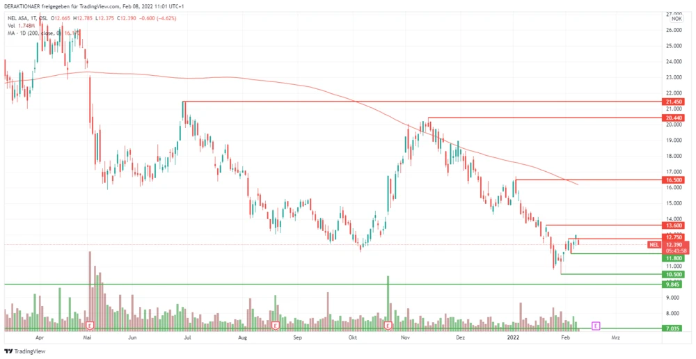 Charttechnisch gelang der Nel-Aktie dank des Rückenwindes von Goldman am gestrigen Montag der Sprung über den Widerstand bei 12,75 NOK. Durch die kritische Stimme der HSBC sackte am heutigen Dienstag der Titel wieder um aktuell 4,6 Prozent ab. Der nächste Support steht bei 11,80 NOK bereit. Sollte auch diese Marke nicht halten, müssen die Anleger auf die massive Unterstützung am Jahrestief bei 10,50 NOK hoffen.